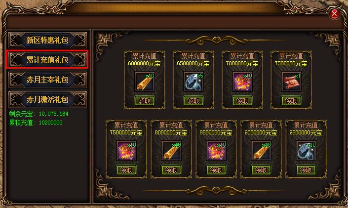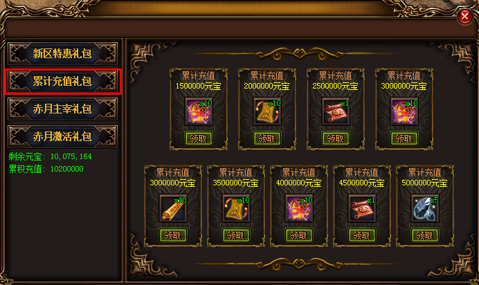 累计充值达到活动规定的元宝数量即可领取一次奖励,此奖励为一次性,不能重复领取。